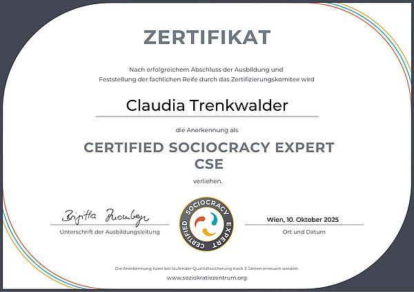 - Expertin für partizipative Organisationsentwicklung (Schwerpunkt Soziokratie)